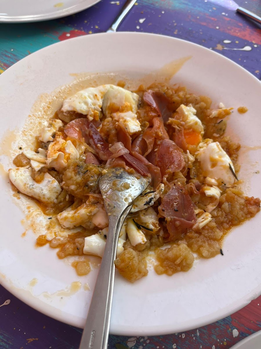 What an experience was Le Sol. My friend saw this place on her way into the center of Alicante and insisted we had to go and try it. At first glance and walking into the place I felt a sense of clutterness and bomb of colors. The menu works as you pick 4 plates and it includes bread and dessert each. We ordered the Camembert with truffle, goat cheese salad, Thai lasagna, and huevos rotos. The star for us was the Thai lasagna meanwhile all the others were okay. It was a lot of food for two people and we didn’t end up finishing the huevos rotos. Overall, I would say it’s more of an atmosphere experience than a food experience but had a nice time!