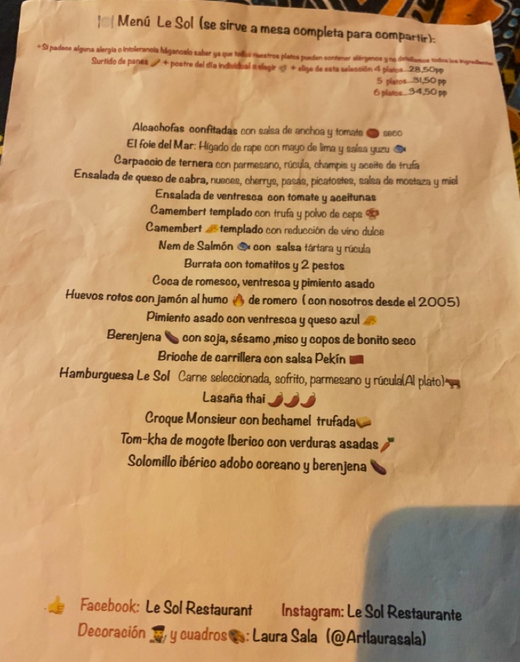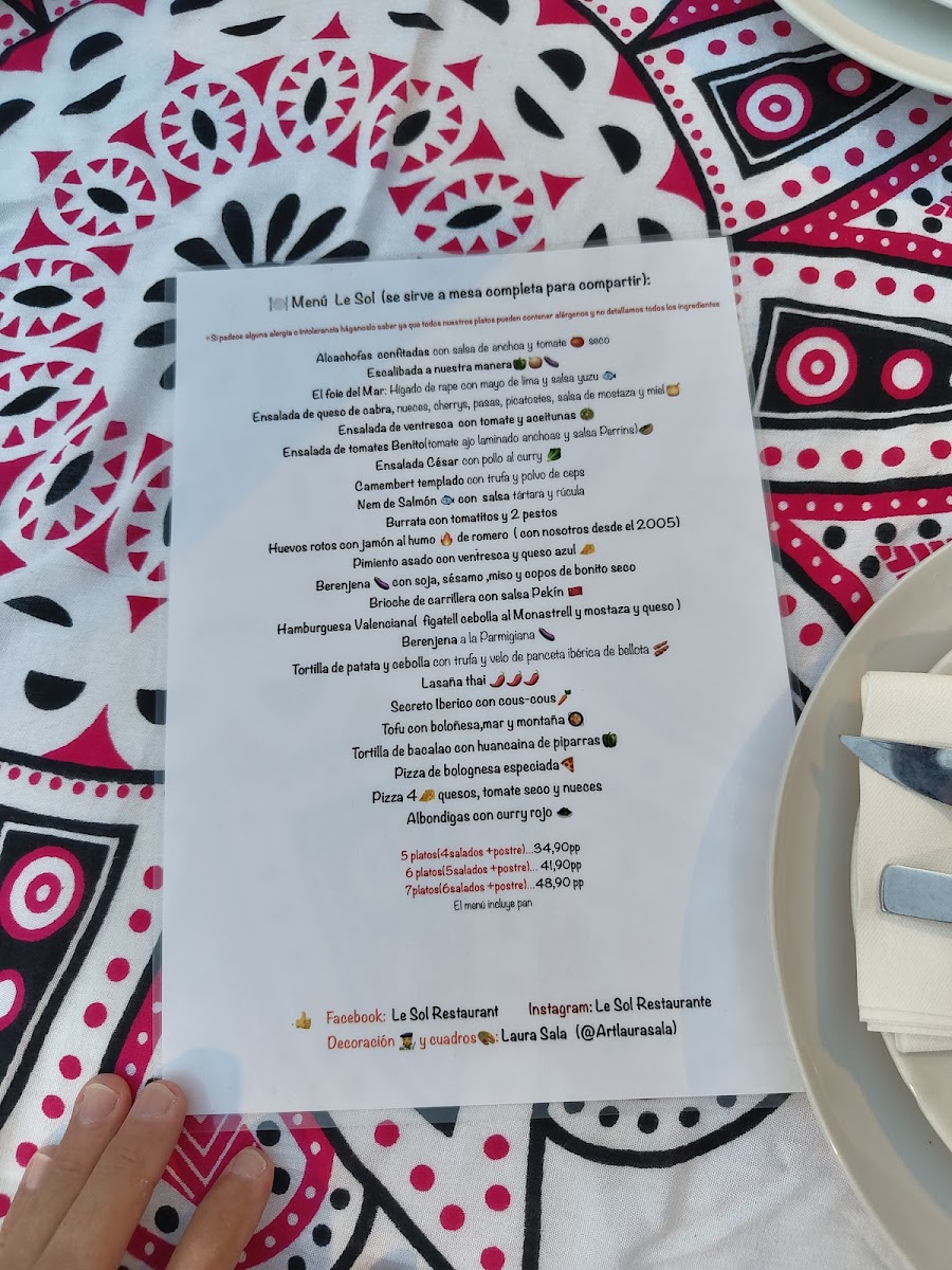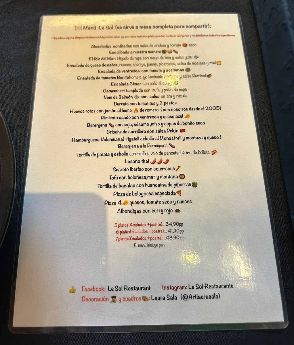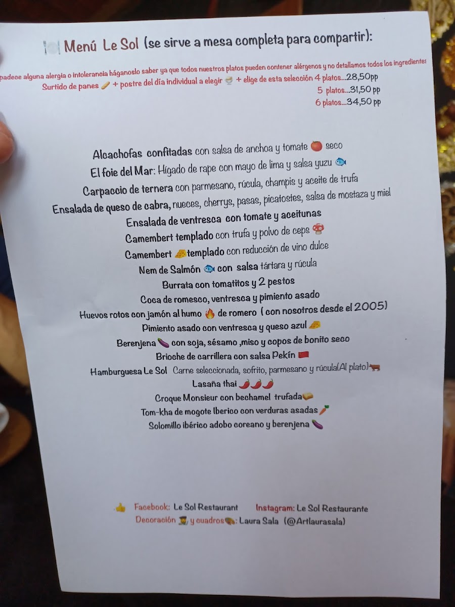 The menu features a variety of flavorful choices, from comforting classics like Huevos Rotos with smoky rosemary ham to more adventurous plates such as the Lasaña Thai and Carpaccio de Ternera con Champiñones. Light starters like Ensalada Queso de Cabra and Nem de Salmón con Salsa Tártara y Rúcula are perfect for starting a leisurely evening. The inclusion of breads, desserts like Tarta de Queso con Helado de Cerezas, and well-paired wines enhances the dining experience without overwhelming it.
