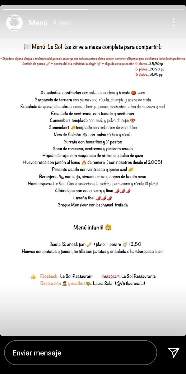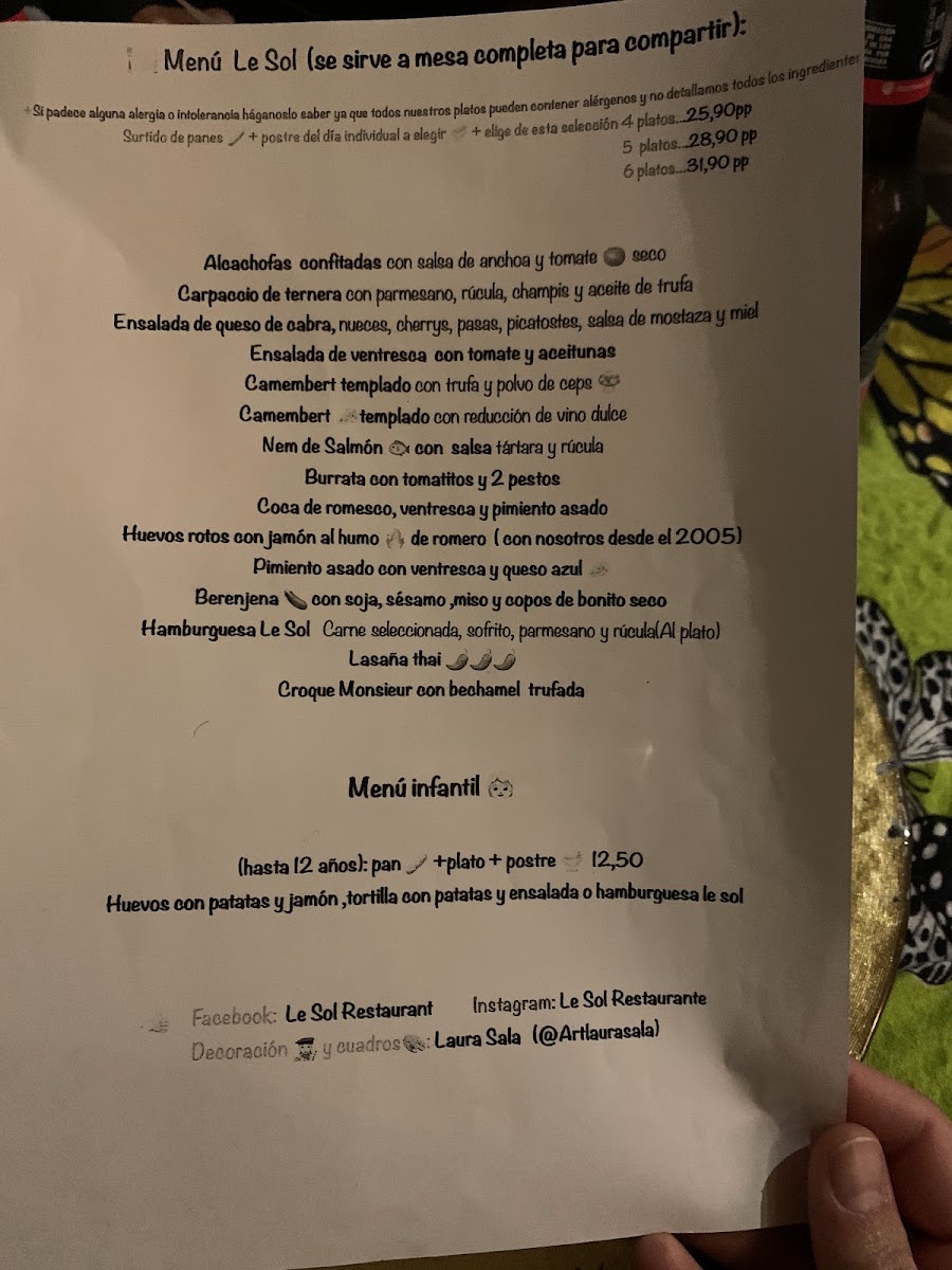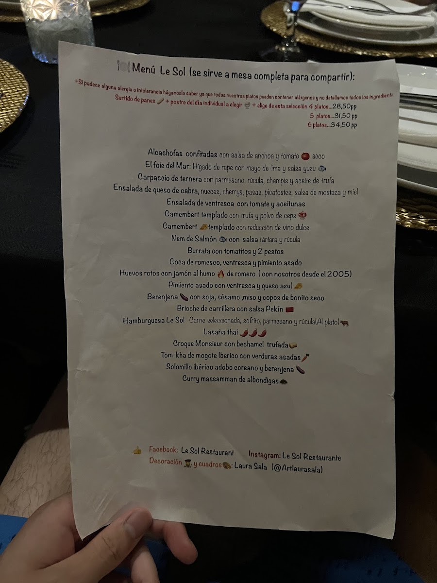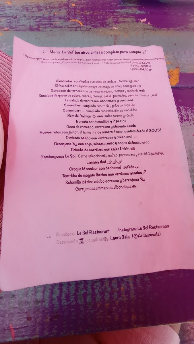 The menu features a variety of flavorful choices, from comforting classics like Huevos Rotos with smoky rosemary ham to more adventurous plates such as the Lasaña Thai and Carpaccio de Ternera con Champiñones. Light starters like Ensalada Queso de Cabra and Nem de Salmón con Salsa Tártara y Rúcula are perfect for starting a leisurely evening. The inclusion of breads, desserts like Tarta de Queso con Helado de Cerezas, and well-paired wines enhances the dining experience without overwhelming it.